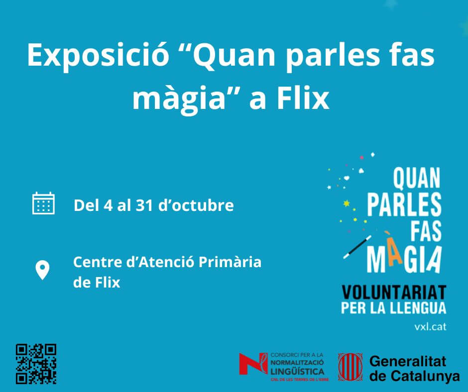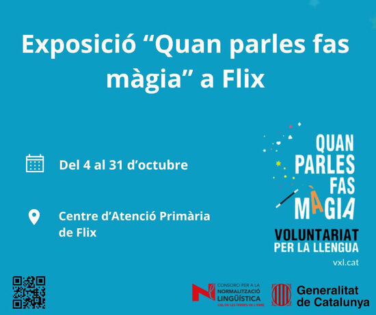 Del 4 al 31 d’octubre 2024, al Centre d’Atenció Primària de Flix, hi haurà instal·lada l'exposició del Voluntariat per la llengua (VxL) "Quan parles fas màgia".