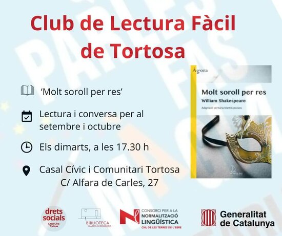 El dimarts 24 de setembre, a les 17.30 h, al Casal Cívic i Comunitari Tortosa arranca una nova edició del Club de Lectura Fàcil amb el llibre 'Molt soroll per no res’.