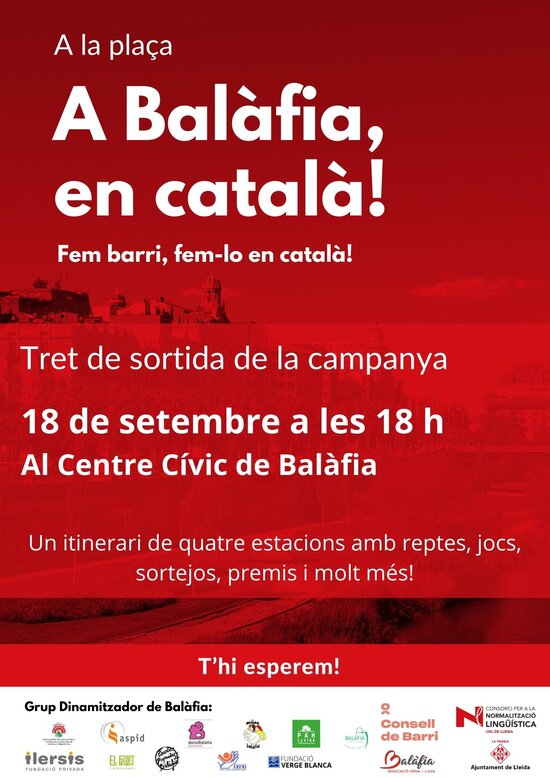 La campanya “A Balàfia, en català!” té com a objectiu fomentar l’ús de la llengua catalana en diferents sectors del barri de Balàfia, com per exemple al comerç, les entitats o la restauració… Per aconseguir-ho, es treballa conjuntament amb les entitats i associacions locals per desplegar-hi els programes del CPNL, com el Totjoc, els Comerços aprenents o el Voluntariat per la llengua.