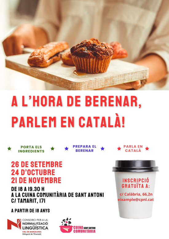 Des del Centre de Normalització Lingüística de Barcelona-Delegació de l'Eixample i en col·laboració amb la Cuina Comunitària de Sant Antoni es farà una nova activitat gratuïta, cada dijous de final de mes, a les 18 h. L'activitat té com a objectiu practicar el català mentre preparem el berenar en un ambient distès i divertit. Les inscripcions es poden fer a través del correu eixample@cpnl.cat o bé al carrer Calàbria, 66, 2n. Us hi esperem!