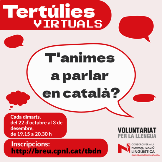 Aquesta tardor-hivern, el CNL de Badalona i Sant Adrià torna a oferir les tertúlies virtuals. Es tracta d'un cicle de set tertúlies en sessió de tarda, pensades per a aquelles persones que vulguin practicar la conversa en català i millorar l'expressió oral. L'únic requisit per participar-hi és tenir un mínim de fluïdesa en l'expressió oral o bé haver cursat el nivell Bàsic 3 (o cursos superiors). A cada sessió, els participants parlaran sobre diversos temes d'actualitat en un ambient distès.