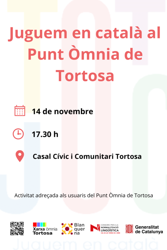 El dijous 14 de novembre, a les 17.30 h, hi haurà una sessió de jocs en català adreçada als usuaris del Punt Òmnia de Tortosa.