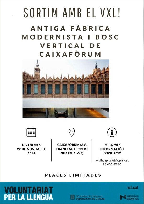 Divendres 22 de novembre alumnes dels cursos de català i participants del Voluntariat per la llengua del Centre de Normalització de l'Hospitalet visitarem l'edifici del CaixaForum Barcelona, ubicat a l'antiga fàbrica tèxtil Casaramona, obra de Josep Puig i Cadafalch, un dels exemples més destacats de l'arquitectura modernista industrial catalana de començament del segle XX. Un edifici del 1912 declarat monument històric artístic d'interès nacional el 1976.