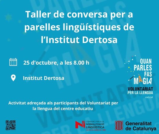 El divendres 25 d'octubre, a les 8.00 h, a l'Institut Dertosa hi ha haurà un taller de conversa adreçat a les parelles lingüístiques del centre educatiu.