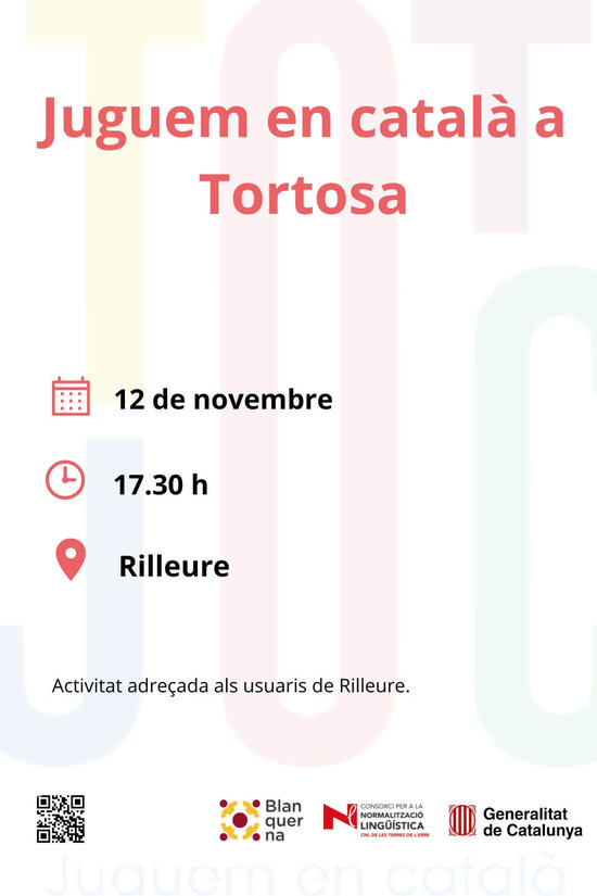 El dia 12 de novembre, a les 17.30 h, es realitzarà un taller de jocs en català adreçat als infants que assisteixen a l’activitat extraescolar ‘Rilleure’ del Grup Esplai Blanquerna de Tortosa.