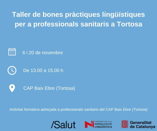 Els dies 6 i 20 de novembre de 2024, de 13 a 15 h, tindrà lloc el taller de Bones pràctiques lingüístiques per a professionals sanitaris. La formació està adreçada als professionals sanitaris del Centre d'Atenció Primària Baix Ebre (Tortosa).