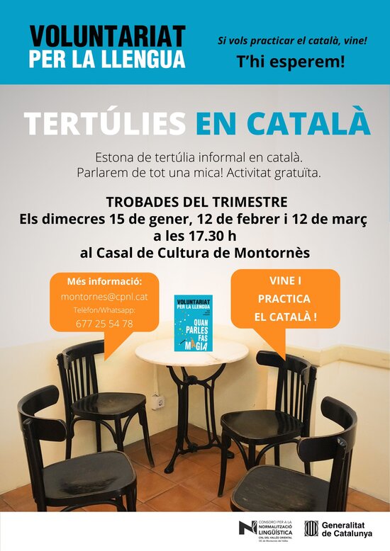 El primer trimestre del curs 2024-2025 s’ha programat una tertúlia cada mes amb una bona assistència de públic. Les tertúlies són una proposta de pràctica oral que se suma al Voluntariat per la llengua i que té com a objectiu animar totes les persones que vulguin practicar l'idioma a venir un cop al mes al Casal de Cultura per fer petar la xerrada durant aproximadament una hora.