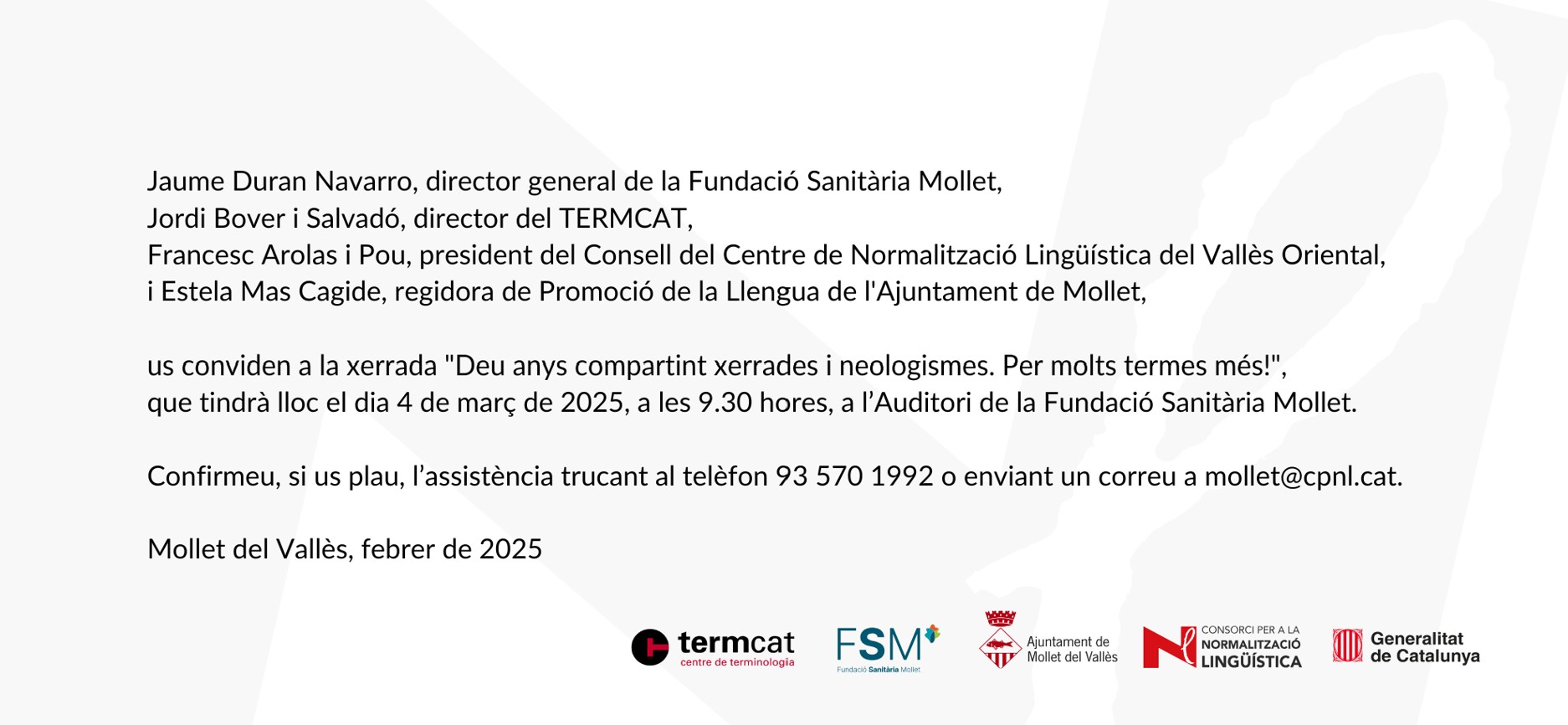 La Fundació Sanitària Mollet, l'Ajuntament i el Servei Local de Català de Mollet (CPNL) organitzen, conjuntament amb el Centre de Terminologia de la llengua catalana (TERMCAT), la 10a xerrada sobre terminologia catalana amb el títol "Deu anys compartint xerrades i neologismes. Per molts termes més!", a càrrec de M. Antònia Julià Berruezo, terminòloga i responsable del Servei de Consultes, i dinamitzadora del Portal Ciències de la Vida del TERMCAT. L'acte es farà el dimarts 4 de març, de 9.30 h a 11 h, a l'Auditori de l'Hospital de Mollet (carrer de Santa Perpètua, 65, Mollet del Vallès).