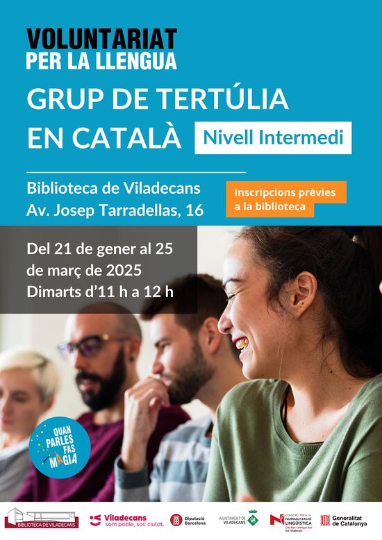 El 21 de gener començarà un grup de tertúlia en català organitzat pel Servei Local de Català i la Biblioteca de Viladecans. El grup, que estarà conduït per un voluntari del Voluntariat per la llengua, està adreçat a persones que tenen un coneixement intermedi de català i volen adquirir més fluïdesa a l'hora de parlar-lo.