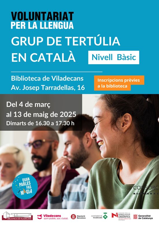 El 4 de març començarà un nou grup de tertúlia en català organitzat pel Servei Local de Català i la Biblioteca de Viladecans. El grup, que estarà conduït per una voluntària del Voluntariat per la llengua, està adreçat a persones que tenen coneixements bàsics de català i volen adquirir fluïdesa a l'hora de parlar-lo.