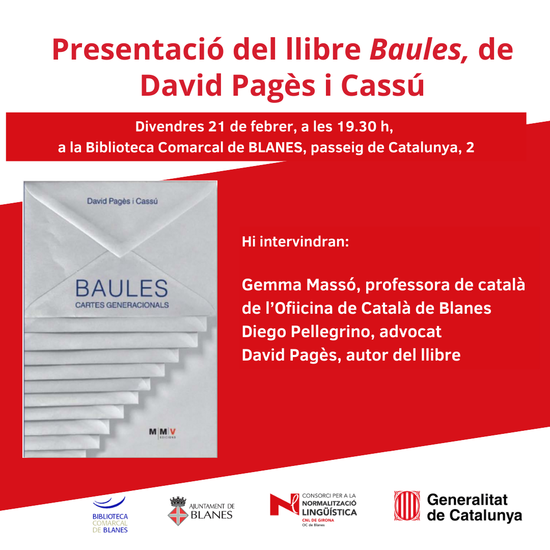 divendres 21 de febrer, a les 19 h, la Biblioteca Comarcal de Blanes acollirà la presentació del llibre Baules de l’autor David Pagès i Cassú, a la qual assistiran els alumnes dels nivells Elemental 2 i Suficiència 2 de català i les parelles lingüístiques del programa de Voluntariat per la llengua.