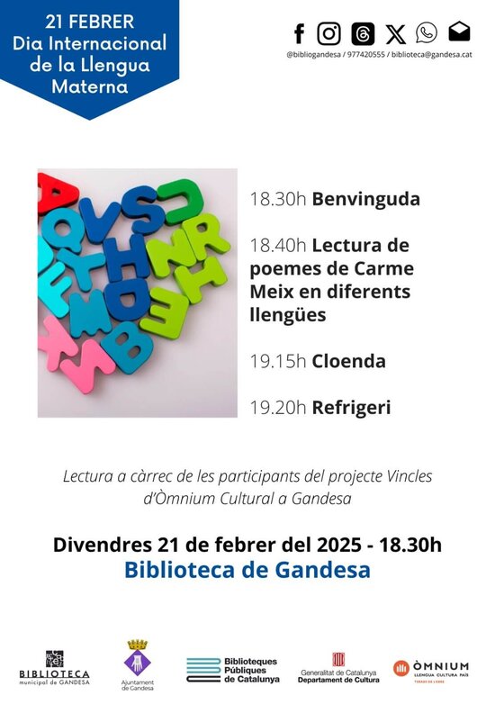 Gandesa celebra el Dia Internacional de la Llengua Materna el dia 21 de febrer, a les 18.30 h, a la Biblioteca Joan Baptista Manyà. Durant l'acte hi haurà una lectura de poemes de Carme Meix a càrrec dels participants del projecte Vincles d'Òmnium Cultural a la ciutat.