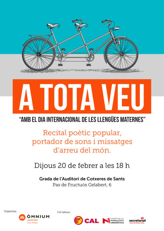 Un any més, amb la finalitat de commemorar el Dia Internacional de la Llengua Materna, el Secretariat de Sants, Hostafrancs i la Bordeta, Òmnium Sants, el Consorci per a la Normalització Lingüística (CPNL) i la CAL s'han unit per celebrar l'acte "A tota veu".