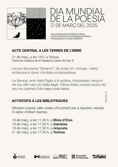 El dia 21 de març, a les 19.00 h, se celebra el Dia Mundial de de la Poesia, a la Cripta de l'església de la Reparació de Tortosa.