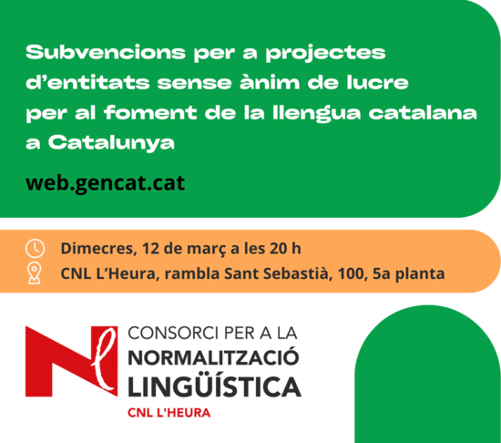 El mes d'abril s'obrirà aquesta línia de subvenció i des del CNL L'Heura s'organitza una reunió per assessorar i animar les entitats de la Xarxa per la llengua a sol·licitar-la. Aquesta presentació també és oberta a qualsevol altra entitat de la ciutat que hi tingui interès.