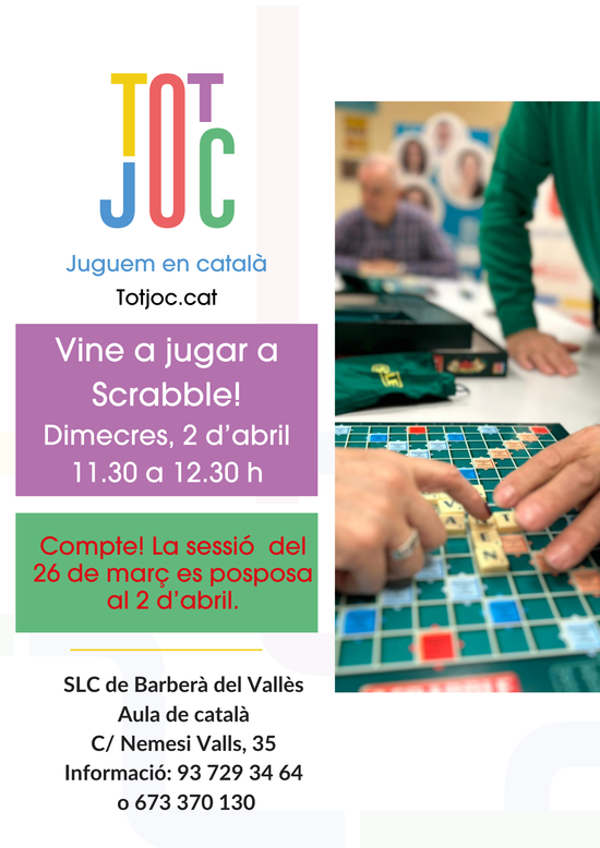 El dimecres 2 d’abril, d'11.30 a 12.30 h, es portarà a terme a Barberà del Vallès una nova sessió del taller de Scrabble en català conduït per persones voluntàries del programa Voluntariat per la llengua.