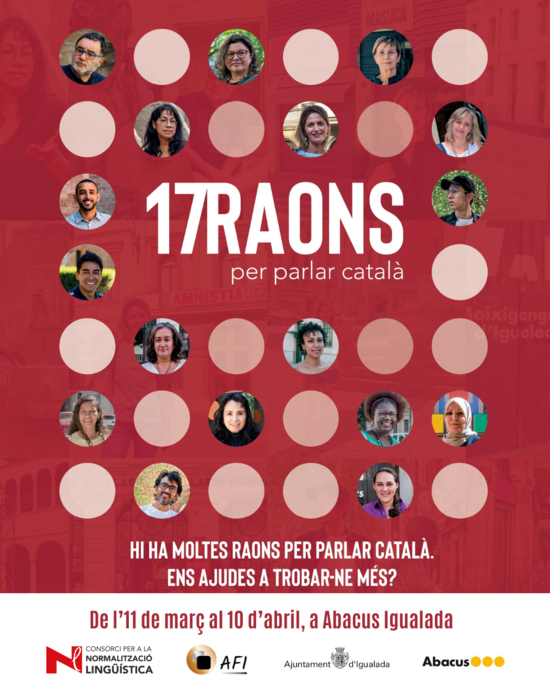 L'exposició fotogràfica "17 raons per parlar català" recull el testimoni de 17 persones de diferents àmbits de la societat igualadina que, tot i que van néixer fora de Catalunya, han adoptat el català com a llengua d'ús habitual. Aquestes persones ens demanen que els parlem en català, que defugim prejudicis i que evitem el costum de canviar de llengua amb qui pensem que és foraster.