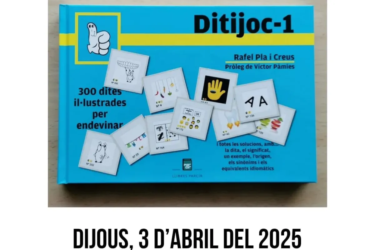 Aquest dijous, 3 d’abril, a les 6 de la tarda, tindrà lloc a Santa Coloma de Farners la presentació del llibre Ditijoc-1, de Rafel Pla i Creus. Es tracta d’un recull de 300 frases fetes, locucions i refranys il·lustrats i que cal endevinar. El volum inclou les solucions, l’explicació de cada dita, l’origen i les alternatives a altres llengües. L’acte es durà a terme a la Biblioteca Municipal Joan Vinyoli i la presentació anirà a càrrec de l’autor i del responsable del Servei de Català de la Selva i Santa Coloma de Farners, Roger Vilà.