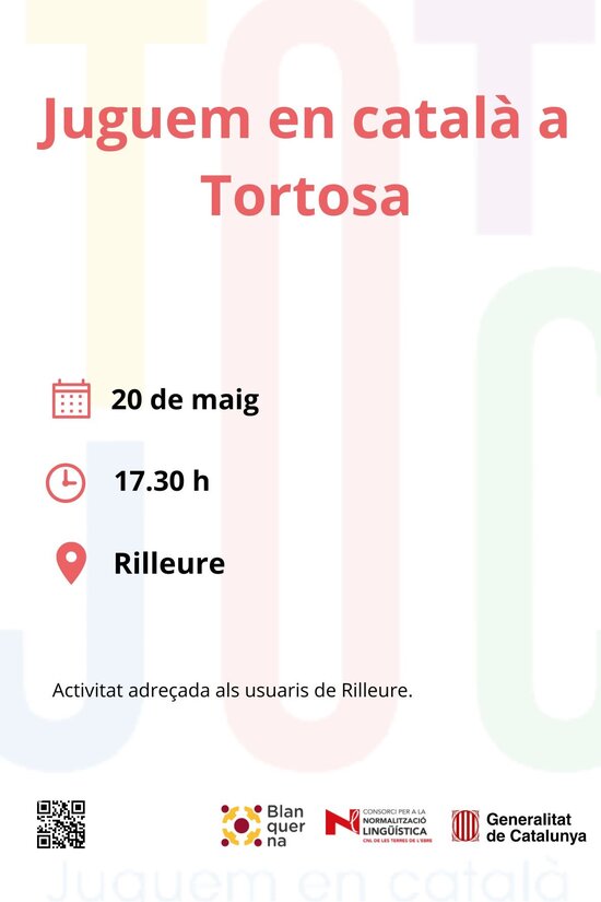 El dia 20 de maig, a les 17.30 h, es realitzarà un taller de jocs en català adreçat als infants i joves que assisteixen a l’activitat extraescolar ‘Rilleure’ del Grup Esplai Blanquerna de Tortosa.