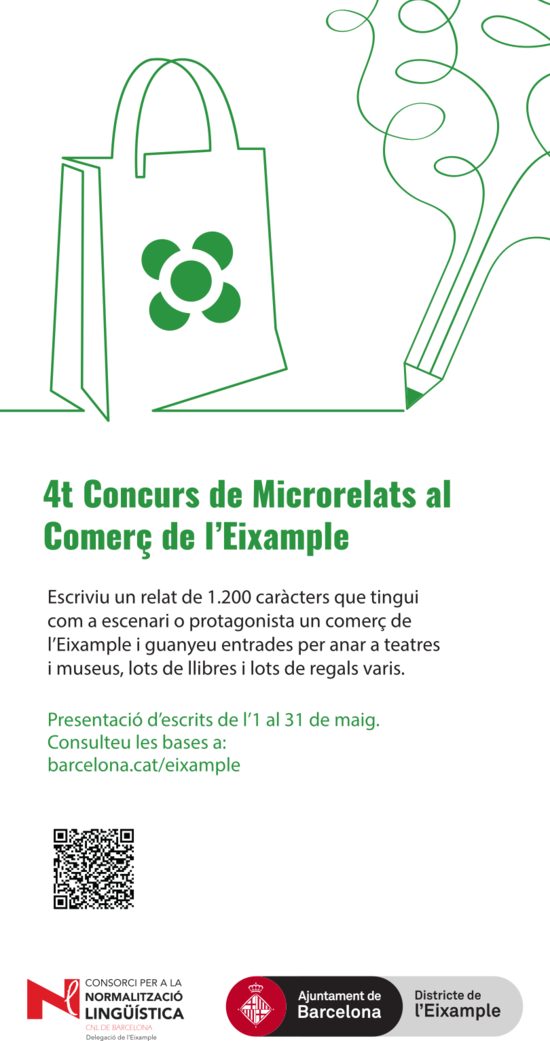 Comerç i mercats, la delegació de l'Eixample del Centre de Normalització Lingüística de Barcelona i l'Oficina de Promoció Econòmica del Districte de l'Eixample, amb la col·laboració dels eixos comercials del districte, posen en marxa la quarta edició del concurs de microrelats al comerç de l'Eixample. L'objectiu és fomentar l'ús de la llengua catalana i donar a conèixer els comerços del districte.