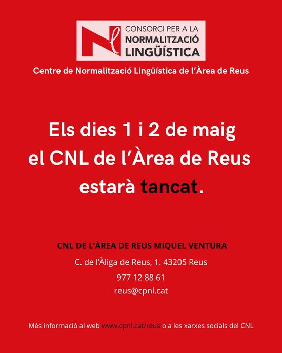 Els CNL de l'Àrea de Reus i tots els seus serveis estaran tancats els dies 1 i 2 de maig.