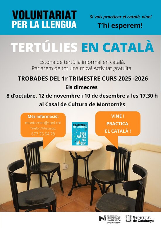 La tertúlia en català és una proposta de pràctica oral que ja es va dur a terme d’octubre a juny del curs 2024-2025. L’objectiu d’aquesta activitat és animar totes les persones que vulguin practicar català a venir un cop al mes al Casal de Cultura per fer petar la xerrada durant aproximadament una hora.