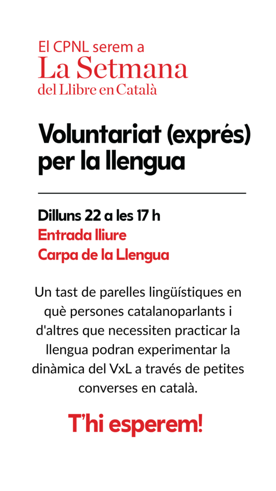 Si vols conèixer de prop el programa Voluntariat per la llengua i experimentar com funciona una parella lingüística, vine a La Setmana del Llibre en Català