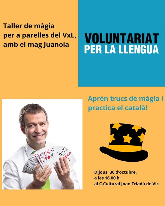 Taller de màgia adreçat als participants del programa de Voluntariat per la llengua a Osona, a càrrec del mag Juanola. Una oportunitat per aprendre trucs senzills de màgia i practicar el català.