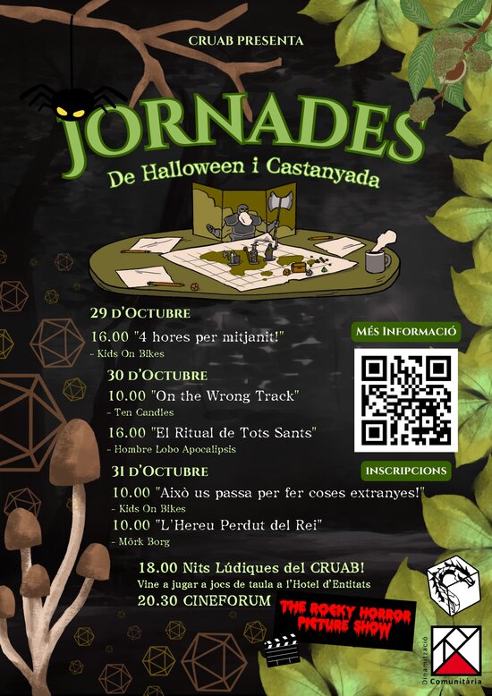 El Club de Rol de la UAB (CRUAB), una entitat universitària amb una trajectòria de més de 30 anys que enguany s'ha adherit al programa Totjoc, organitza unes jornades dedicades als jocs de rol sobre folklore, misteri, història i terror. Els dies 29, 30 i 31 d'octubre tindran lloc partides de jocs de rol en dos torns: matí (10 h) i tarda (16 h) a la sala annexa de l'Hotel d'entitats (planta 1) de la plaça Cívica de la Universitat Autònoma de Barcelona.