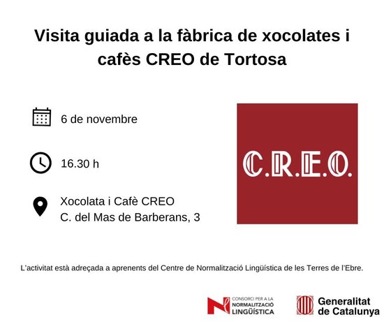 El dijous 6 de novembre, a les 16.30 h, es visitarà la fàbrica Xocolata i Cafè CREO de Tortosa. Es tracta d'una activitat de cohesió social i foment de la llengua catalana adreçada a l'alumnat del CNLTE.