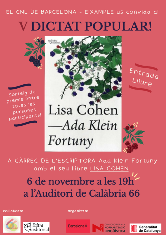 L'Auditori de Calàbria 66 acollirà el V Dictat Popular de l'Eixample el pròxim 6 de novembre a les 19 h. L'activitat anirà a càrrec de l'escriptora Ada Klein Fortuny, que dictarà un fragment de la seva novel·la Lisa Cohen.