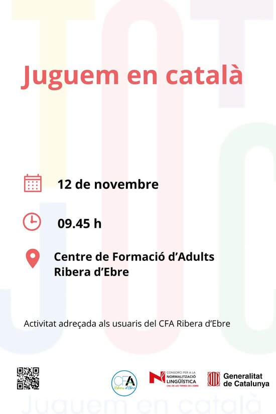 El dimecres 12 de novembre, a les 9.45 h, hi haurà una sessió de jocs en català adreçada a l’alumnat de català del Centre de Formació d’Adults de la Ribera d'Ebre.