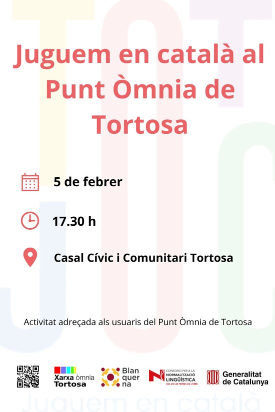 El dijous 5 de febrer, a les 17.30 h, hi haurà una sessió de jocs en català adreçada als usuaris del Punt Òmnia de Tortosa.