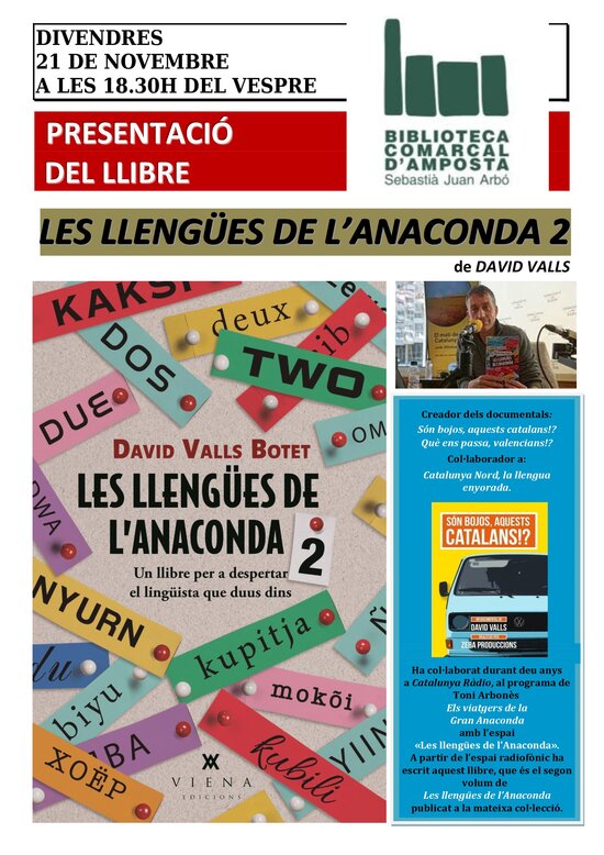 El divendres 21 de novembre, a les 18.30 h, es presenta a la Biblioteca Comarcal Sebastià Juan i Arbó d'Amposta el llibre Les llengües de l'anaconda 2 de David Valls.
