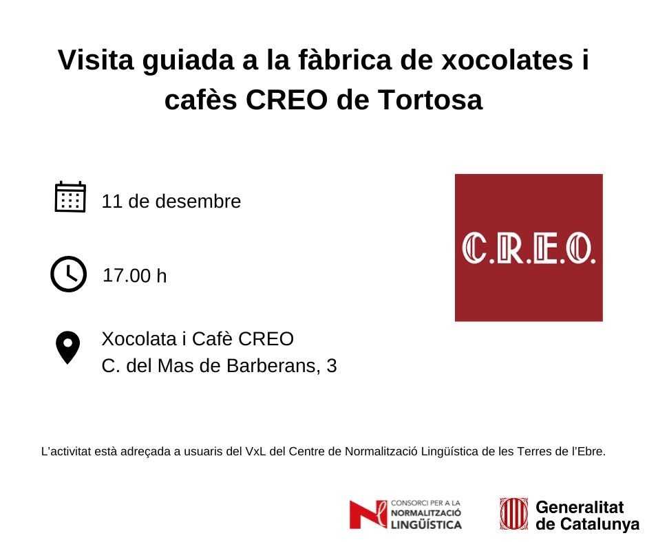 El dijous 11 de desembre, a les 17.00 h, es visitarà la fàbrica Xocolata i Cafè CREO de Tortosa. Es tracta d'una activitat de cohesió social i foment de la llengua catalana adreçada als participants del Voluntariat per la llengua del CNLTE.