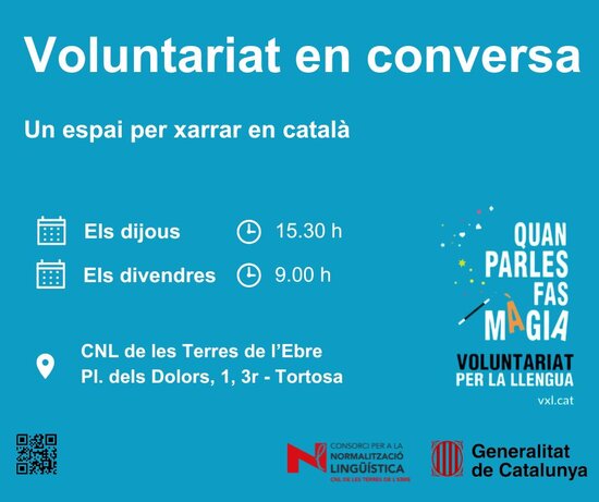 Els divendres, a les 9.00 h, té lloc l’activitat Voluntariat en conversa, al Centre de Normalització Lingüística de les Terres de l'Ebre. Un espai per conversar en català.