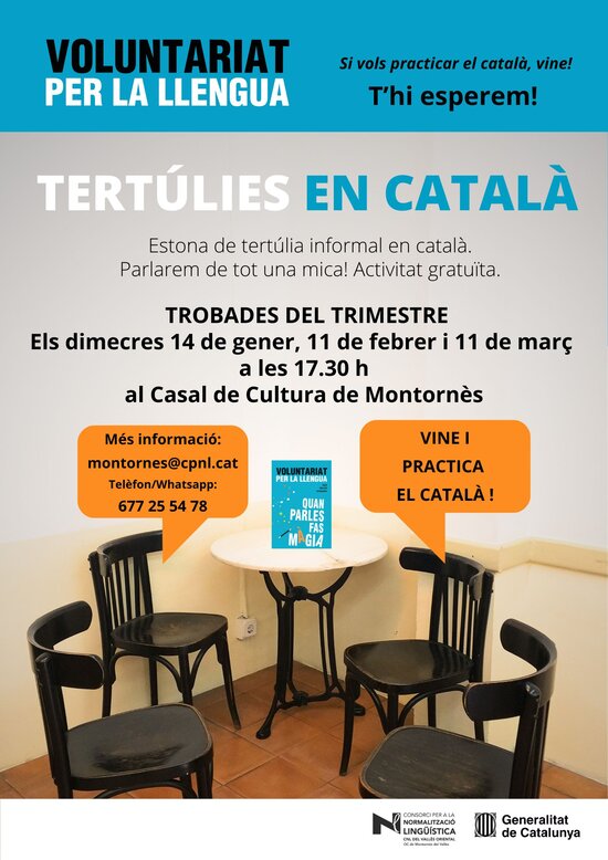 Les tertúlies en català tenen lloc a la Sala Mogent del Casal de Cultura, a l’espai de trobada del Voluntariat per la llengua. Les tertúlies en català continuen en el segon trimestre i tindran lloc els dies:
