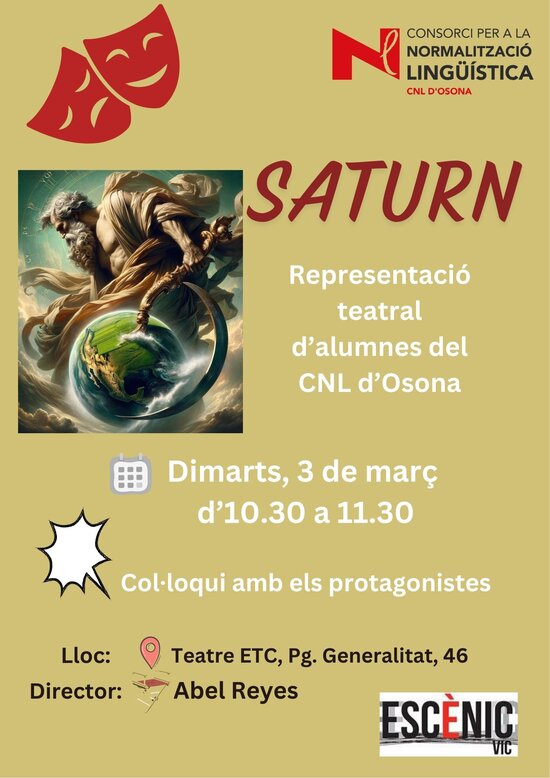 Abel Reyes, actor i professor de teatre d’Escènic Vic, conduirà aquest grup d’alumnes en l’obra Saturn -escrita per Marian Toril, directora d’Escènic-, un text que parla sobre el pas del temps.