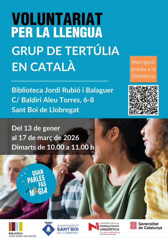 Nou grup de tertúlies en català organitzat pel Servei Local de Català i la Biblioteca Jordi Rubió i Balaguer. El grup, que estarà conduït per un voluntari del Voluntariat per la llengua, està adreçat a persones que ja parlen català, però que en volen augmentar la fluïdesa.