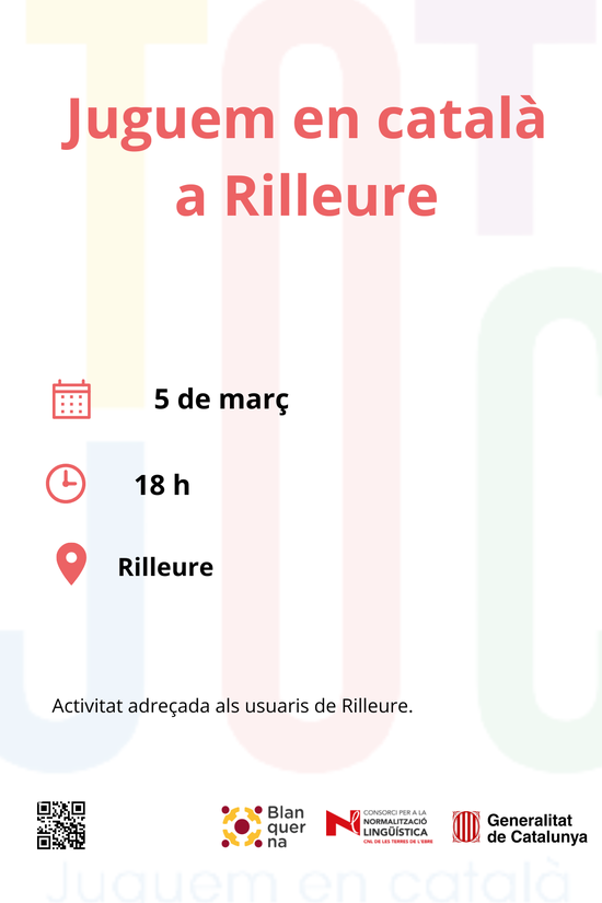 El dijous 5 de març, a les 18 h, hi haurà una sessió de jocs en català adreçada als usuaris de Rilleure de Tortosa.