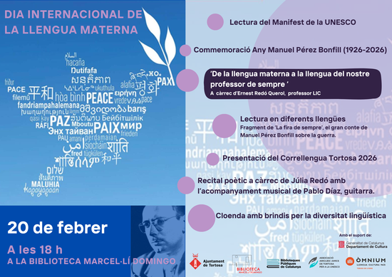 El dia 20 de febrer, a les 18.00 h, se celebra el Dia Internacional de la Llengua Materna a la Biblioteca Marcel·lí Domingo de Tortosa. Durant l’acte es commemorarà Manuel Pérez Bonfill, escriptor tortosí.