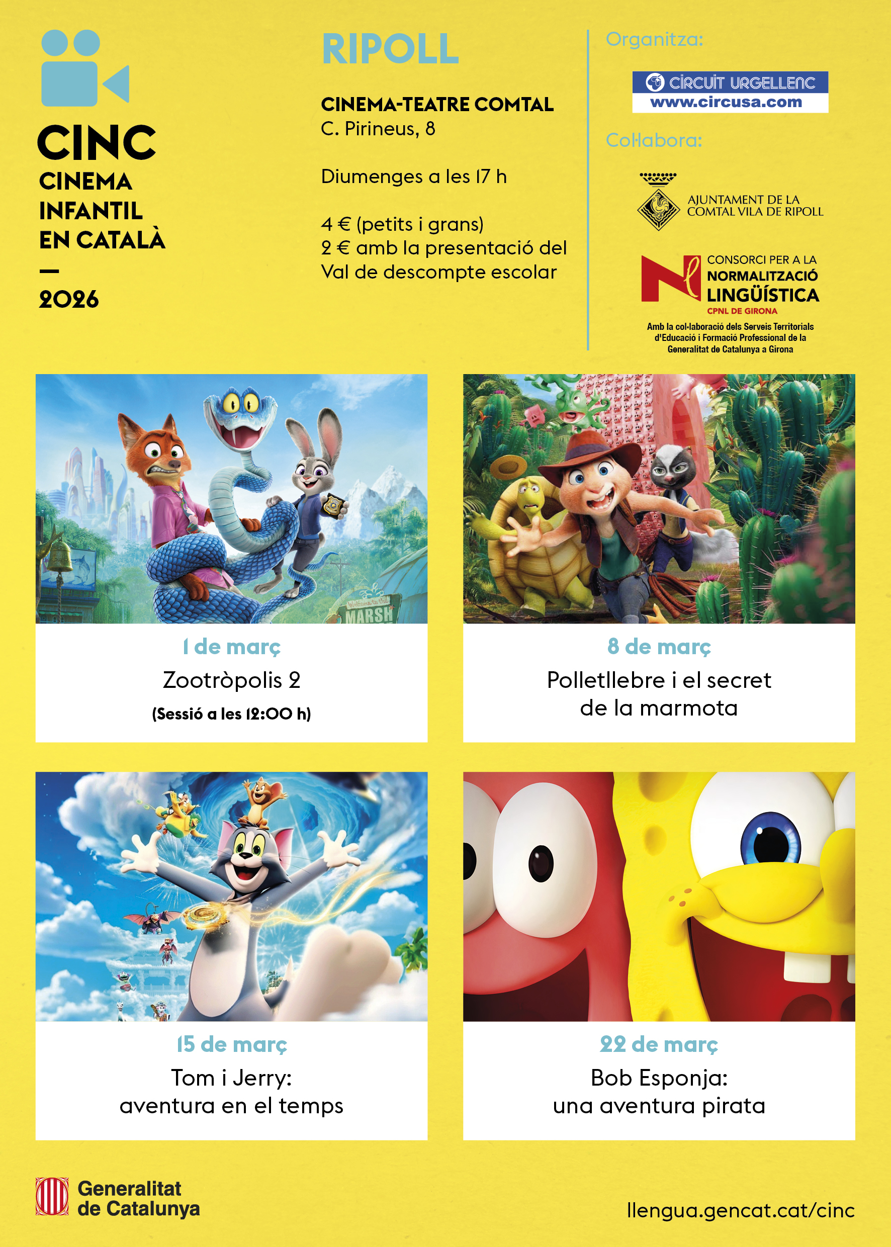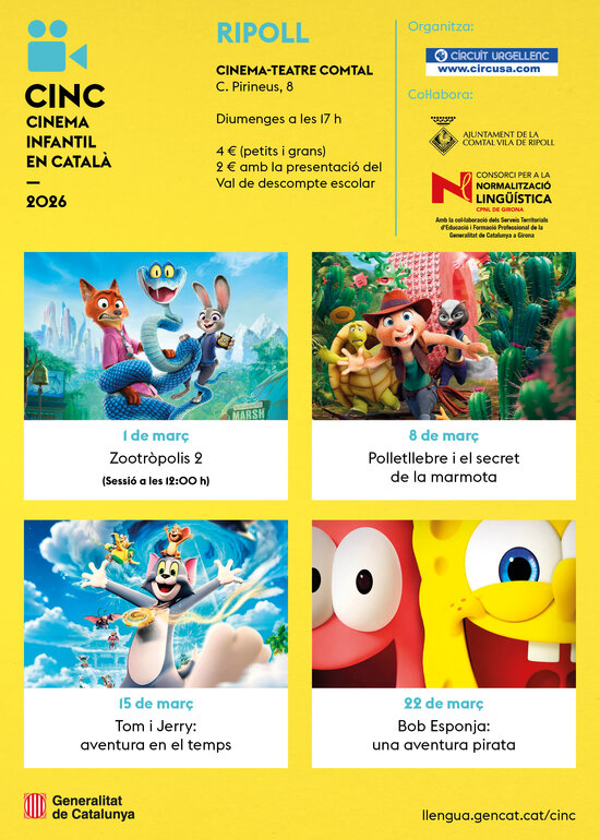 Els films programats són: Zootròpolis 2 (1 de març), Polletllebre i el secret de la marmota (8 de març), Tom i Jerry: aventura en el temps (15 de març) i Bob Esponja: una aventura pirata (22 de març). Zootròpolis 2 es projectarà de matí, a les 12.00, i la resta de les sessions començaran a les 17.00 h.