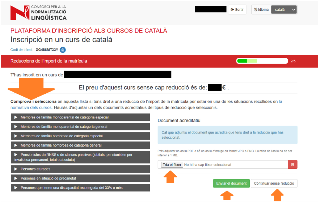 En caso de tener derecho a la reducción de la matrícula, escoge el supuesto que corresponda a tu situación y adjunta el documento vigente que lo acredite.