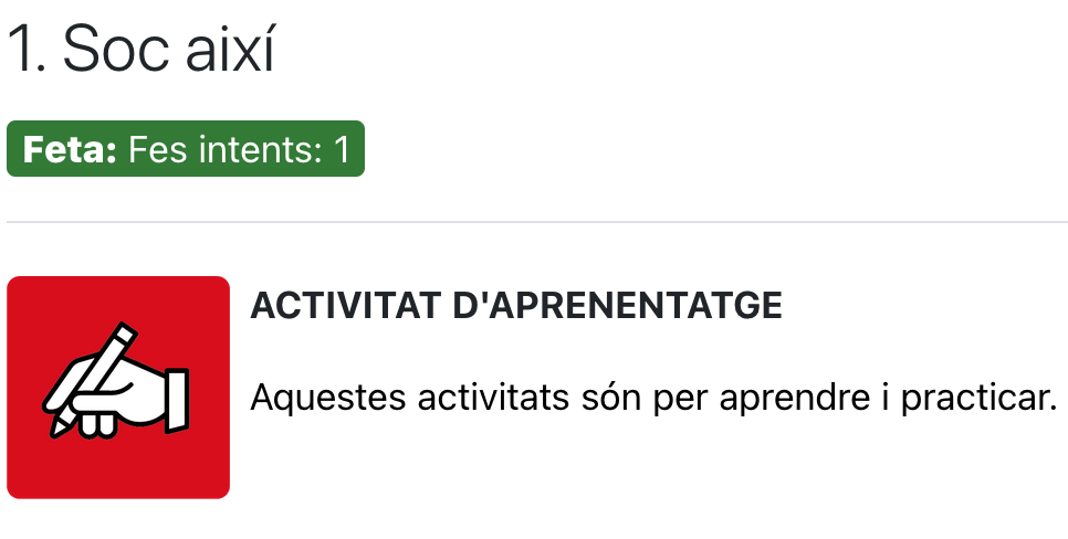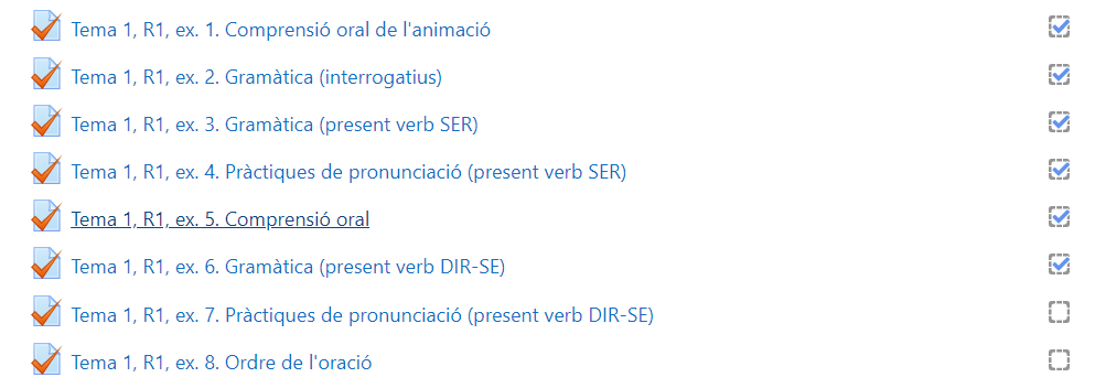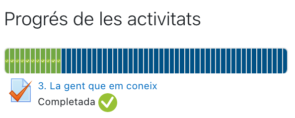 - Vous pouvez également voir si l'activité est terminée dans la barre de progression des activités, dans le menu de droite. Si l'activité est terminée, elle sera surlignée en couleur.