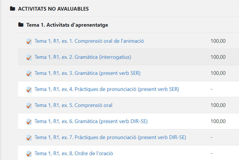 - Entrez l'activité que vous êtes en train de faire et sous le nom de l'activité, vous verrez les critères à remplir pour que l'activité apparaisse comme étant réalisée (afficher, obtenir une note, faire une tentative...).