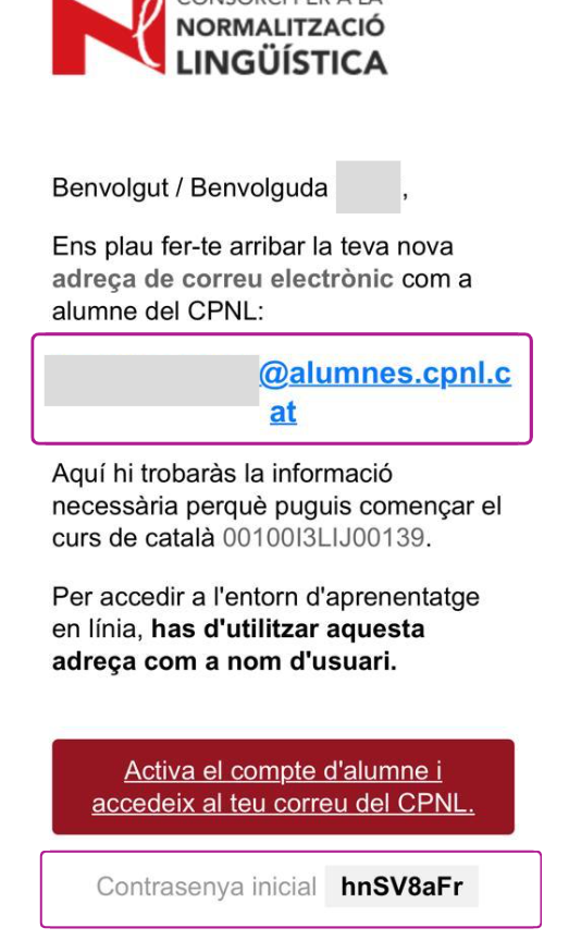 Entrez l’adresse électronique d'étudiant que nous vous avons fournie xxx.xxx(ELIMINAR)@alumnes.cpnl.cat