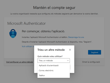 Il existe actuellement trois options pour récupérer le compte si vous avez oublié votre mot de passe. L’option Microsoft Authenticator vous sera proposée par défaut. Si vous ne souhaitez pas utiliser cette méthode, cliquez sur "Je veux configurer une autre méthode".