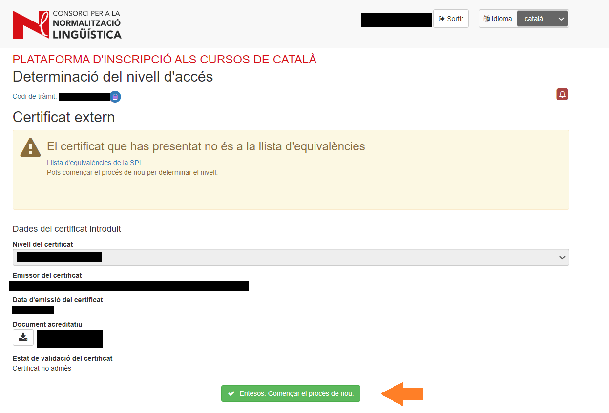 Si le certificat n’a pas été validé, vous devrez demander un test de niveau ou en présenter un autre.