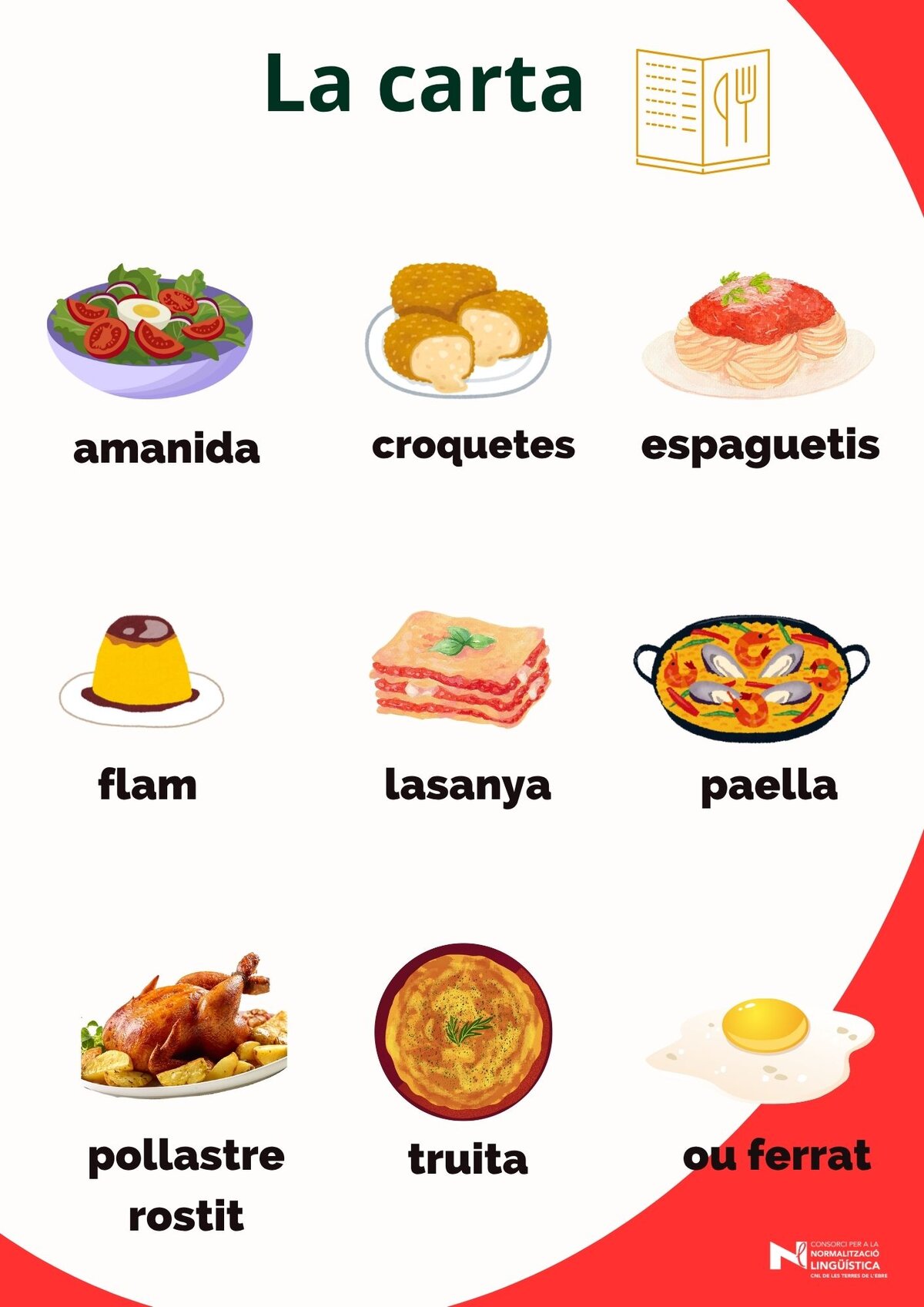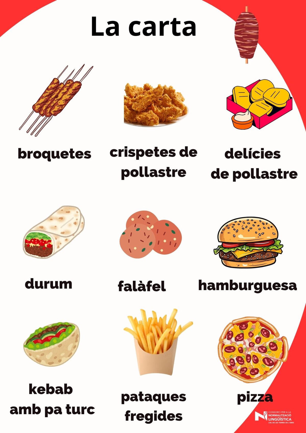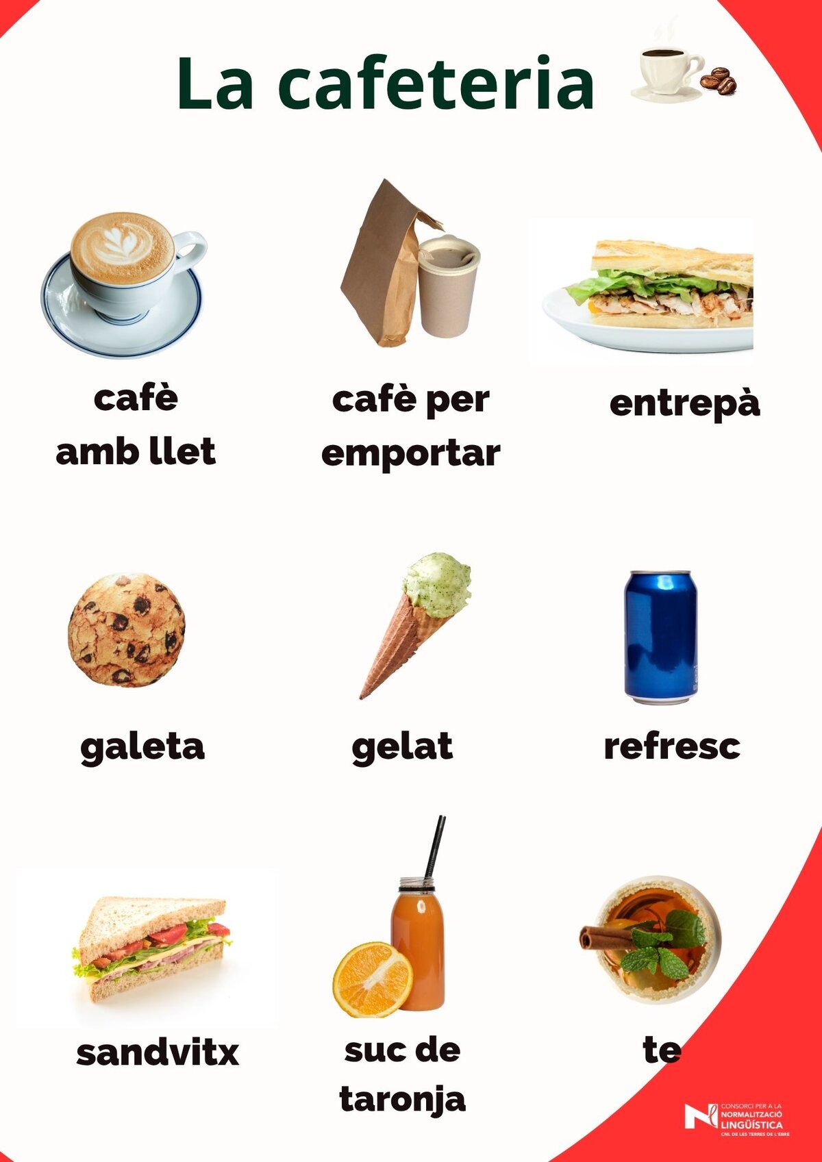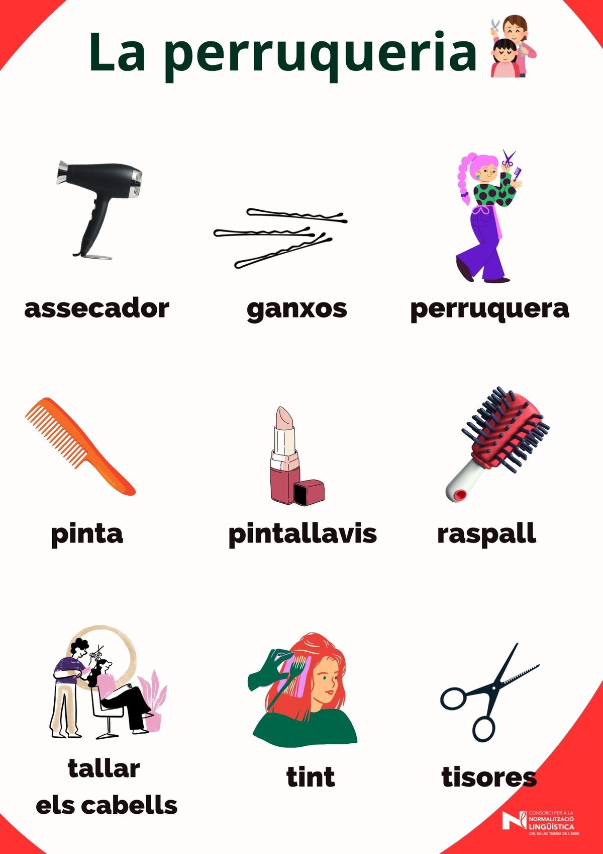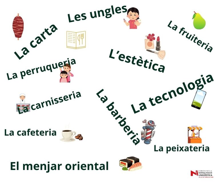 Material divulgatiu que difon el lèxic relacionat amb diferents sectors comercials: la cafeteria, la carnisseria, la carta, l'estètica i les ungles, les fruites i verdures, el menjar oriental, la peixateria, la perruqueria i la tecnologia.