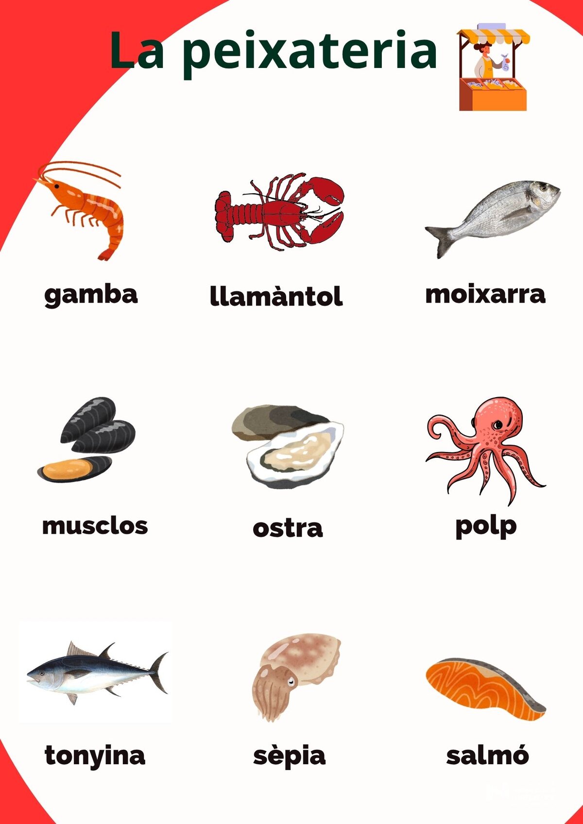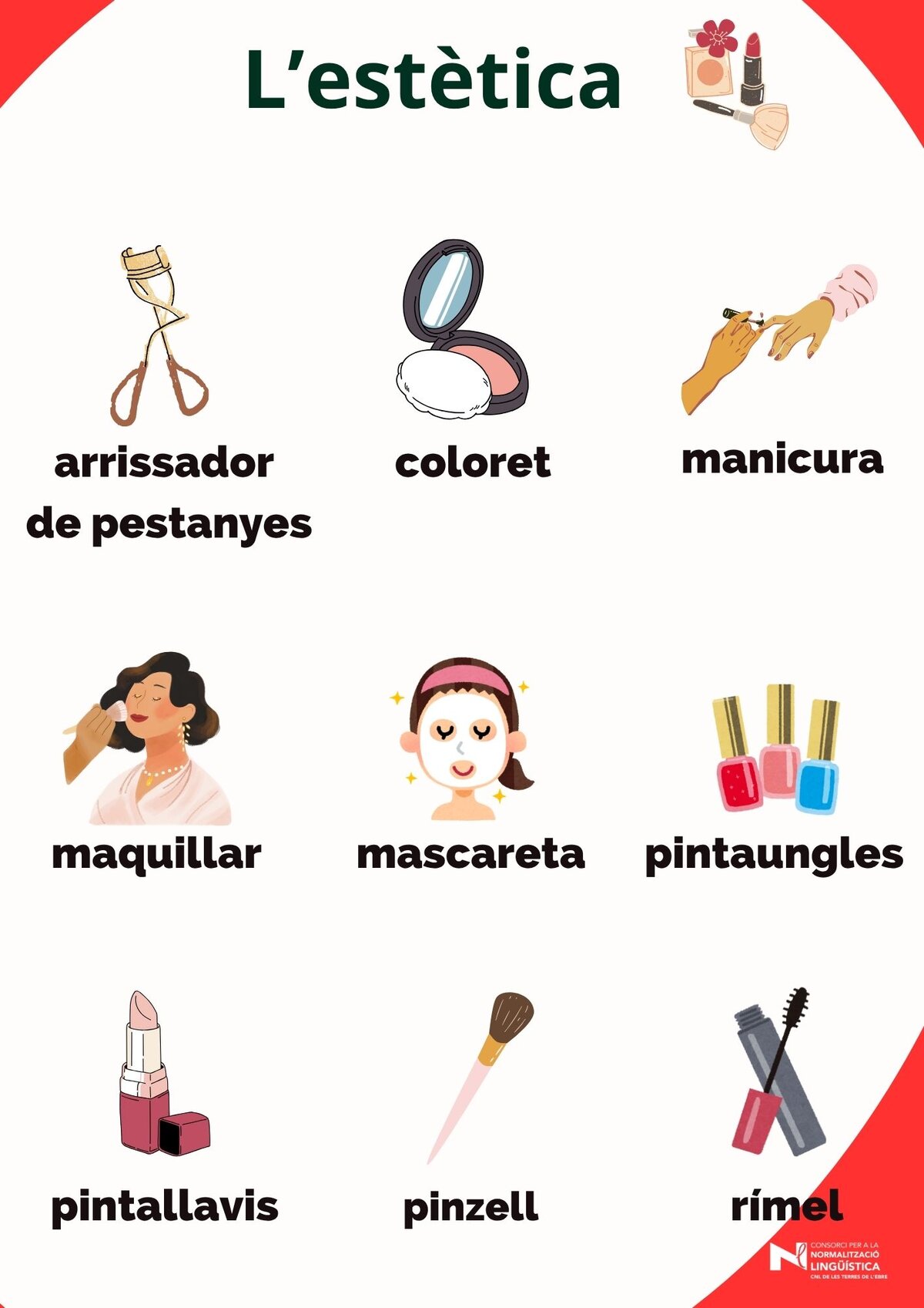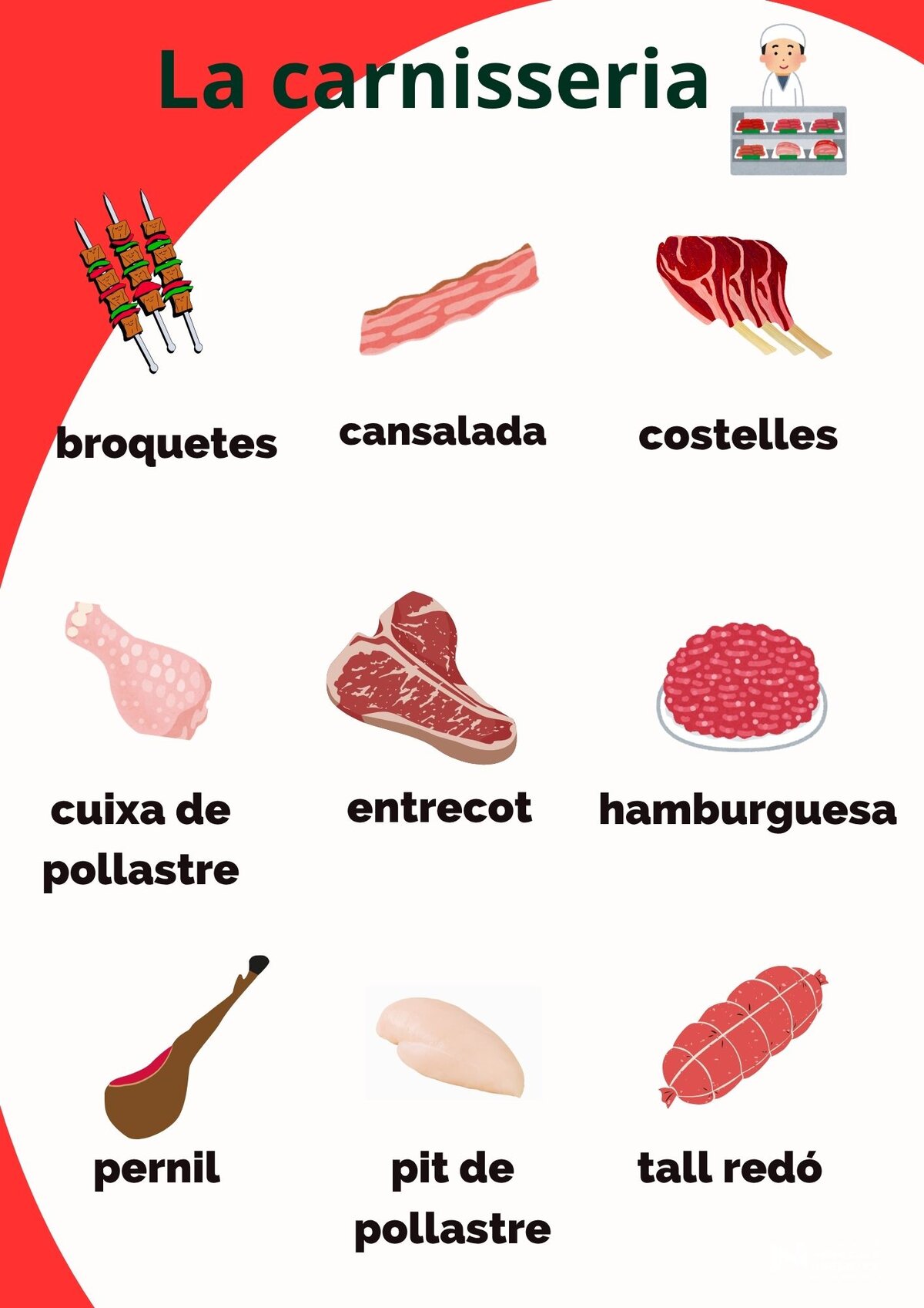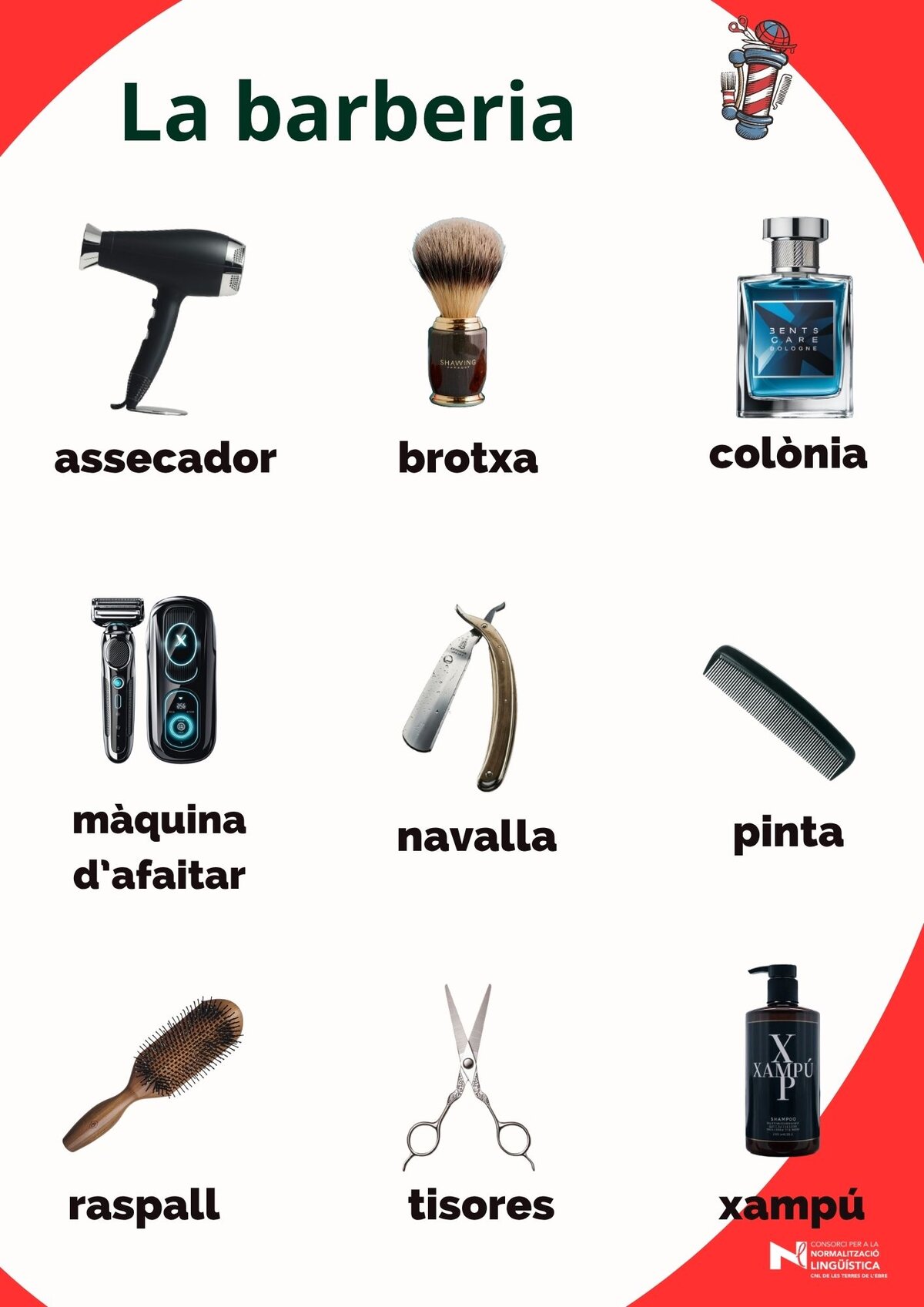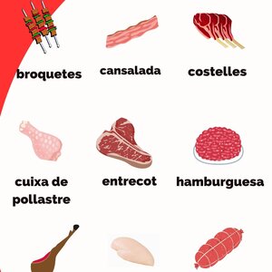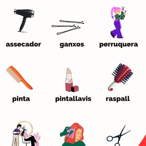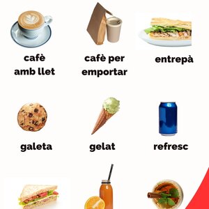 Material divulgatiu que difon el lèxic relacionat amb diferents sectors comercials: la cafeteria, la carnisseria, la carta, l'estètica i les ungles, les fruites i verdures, el menjar oriental, la peixateria, la perruqueria i la tecnologia.